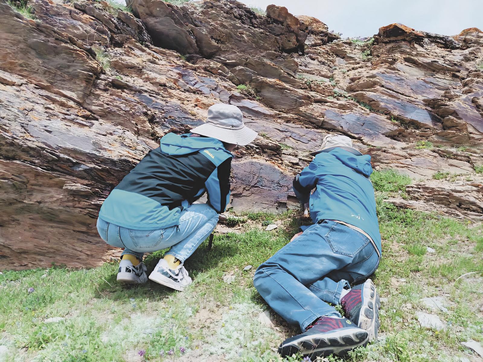 2020年7月5日青海师范大学科考队成员在现场观察石刻。 侯光良供图
