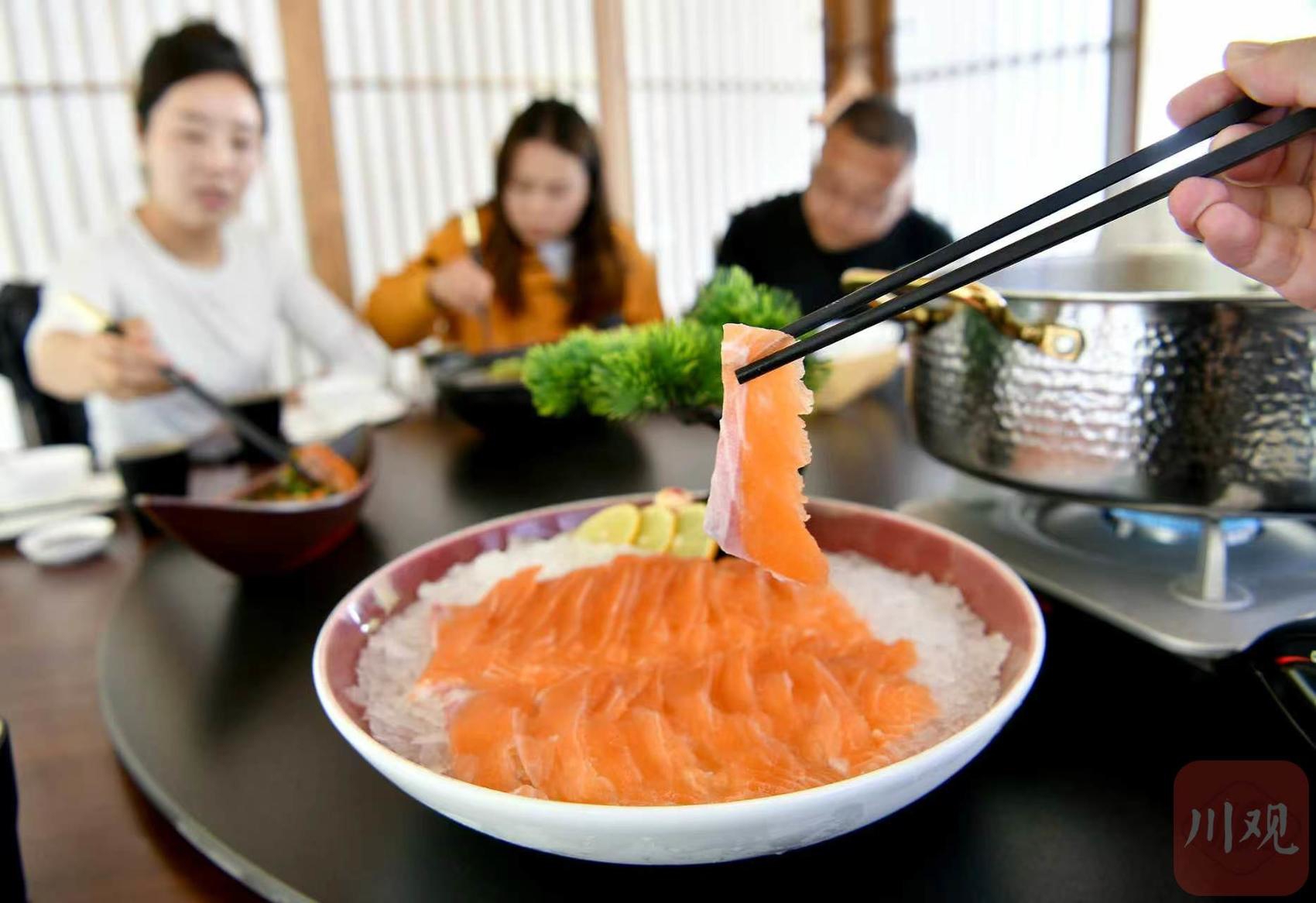 养殖基地现捞现切的三文鱼片。华小峰 摄