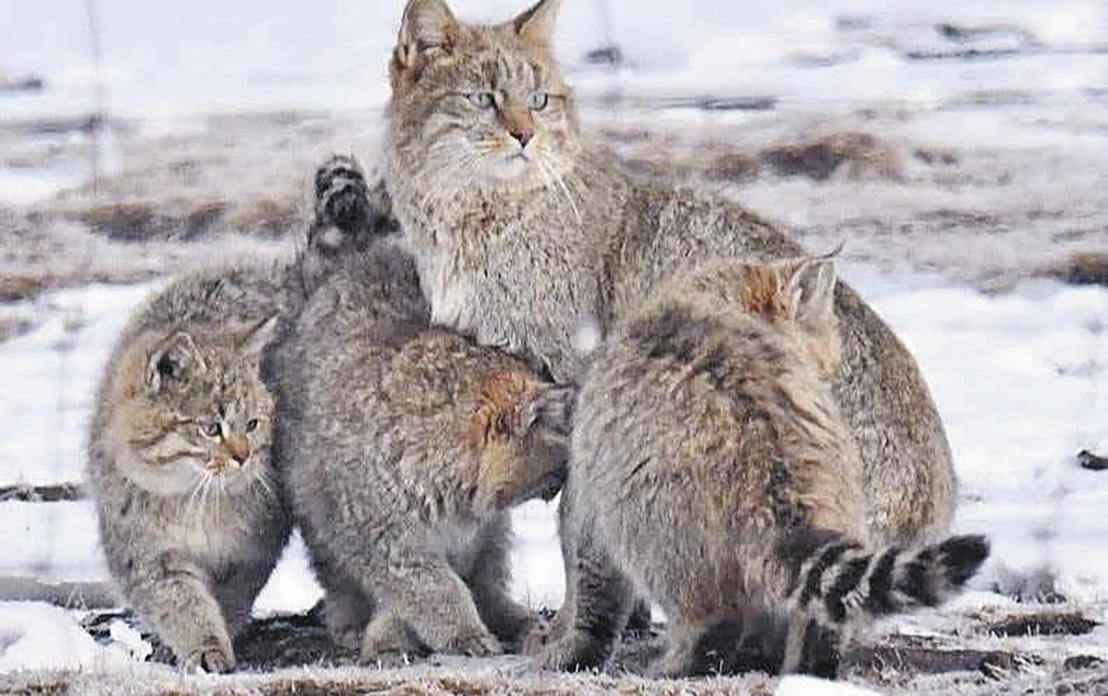 2026年1月生态管护员拍下荒漠猫带三只幼崽的珍贵影像。海北州门源县融媒体中心供图