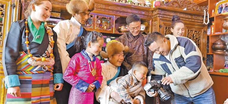 “来,大家看这里!”“咔嚓”一声,相机定格了镜头前旦巴一家四口的笑容。在藏历新年来临之际,墨竹工卡县甲玛乡赤康村村民身穿节日盛装,等待着专业摄影师免费拍摄、现场打印全家福照片,留住与家人欢聚一堂的温馨时刻。
