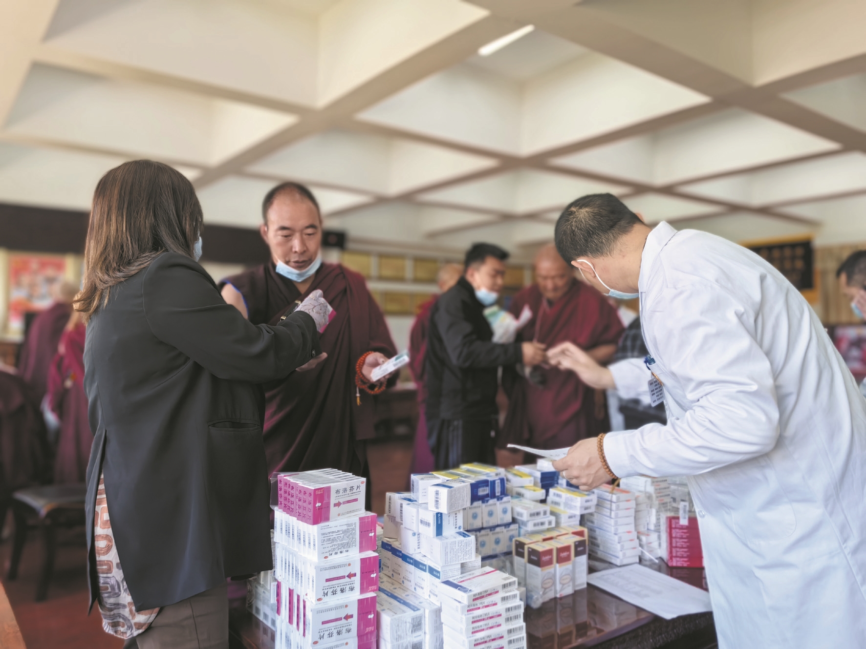 图为义诊现场,北京市第八批援藏医疗队的医务人员热情接待前来就诊和咨询的僧人,并发放药物。 拉萨融媒记者 拉姆次仁摄
