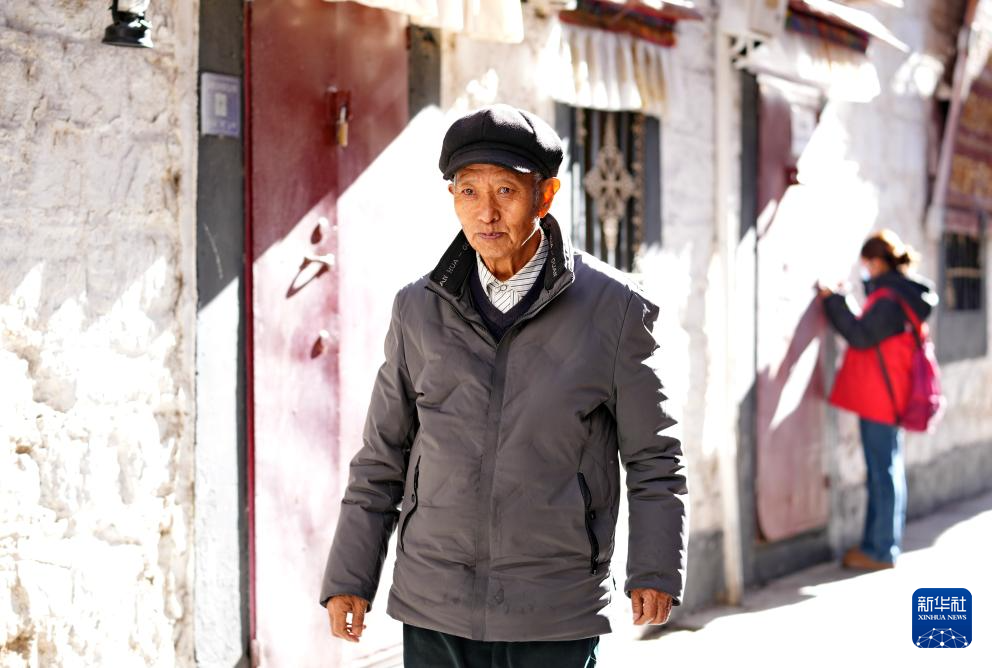 洛桑贡布途经拉萨市老城区的巷道回家(3月27日摄)。