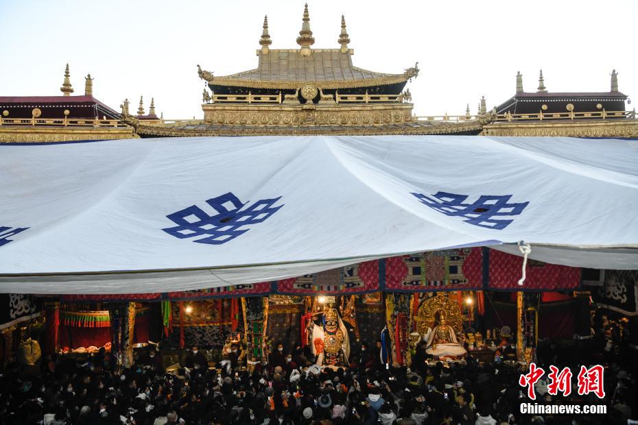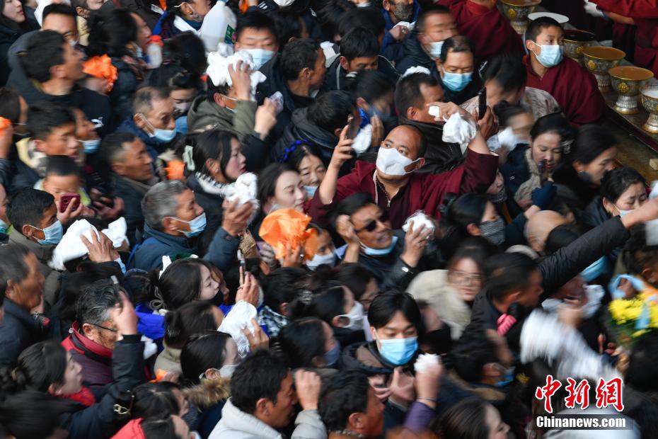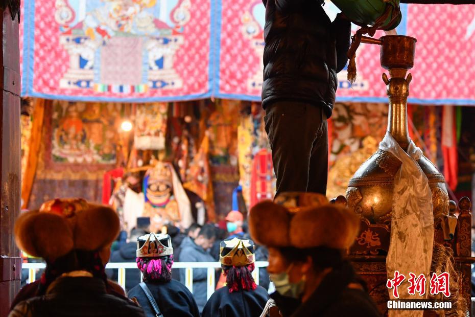 12月15日即藏历十月十五日是藏族传统的节日“白来日追”,俗称“仙女节”、“白拉姆节”等。相传藏传佛教最高护法神之一班丹拉姆的女儿白拉姆,不顾母亲的反对与赤尊赞私定终身,班丹拉姆一怒之下将赤尊赞赶到拉萨河南岸,规定二人仅每年的藏历十月十五日相见。图为工作人员将青稞酒倒入女神白拉姆像前的酒坛。
