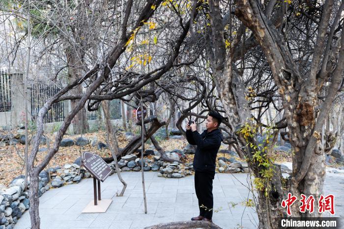 图为游客在曲孜卡乡的古葡萄藤前拍照。薛蒂 摄