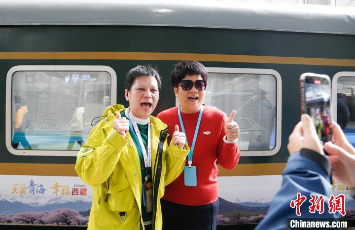 3月26日,乘坐青海首趟直达西藏林芝旅游专列的旅客与列车合影留念。 马铭言 摄