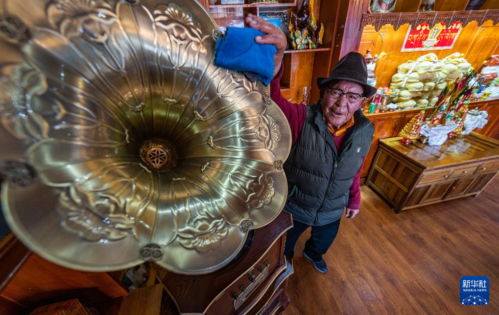 洛桑老人在家中擦拭留声机(3月20日摄)。 新华社记者 丁增尼达 摄