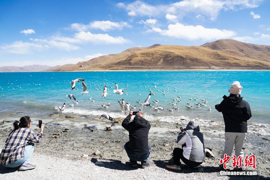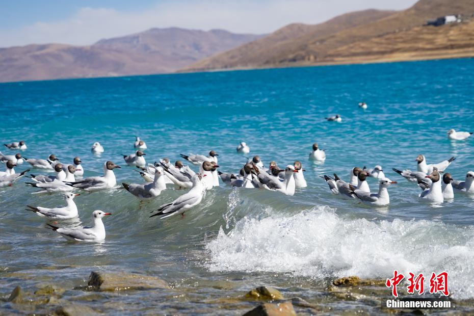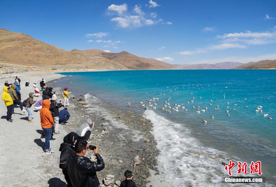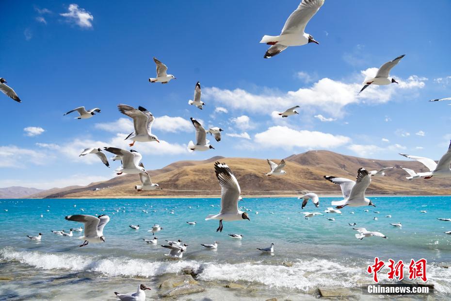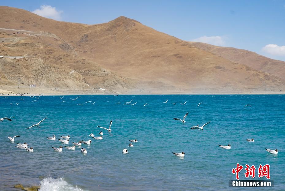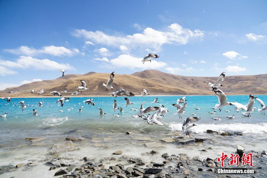 3月31日,位于西藏自治区山南市境内的羊卓雍措沿岸水鸟翔集。羊卓雍措藏语意为“碧玉湖”,是喜马拉雅山北麓最大的内陆湖泊,湖面海拔4440多米。春日,湖水与蓝天、白云、群山相互映衬,成群的水鸟振翅飞翔,构成一幅壮丽的生态画卷。中新社记者 马铭言 摄