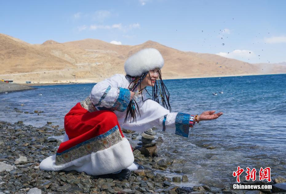 3月31日,游客身着藏族服饰打卡羊卓雍措。羊卓雍措位于西藏自治区山南市境内,是喜马拉雅山北麓最大的内陆湖泊,湖面海拔4440多米。春日,湖水与蓝天、白云、群山相互映衬,成群的水鸟振翅飞翔,构成一幅壮丽的生态画卷。中新社记者 马铭言 摄