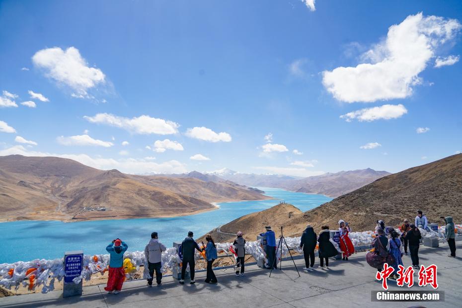 3月31日,游客在羊卓雍措游览。羊卓雍措位于西藏自治区山南市境内,是喜马拉雅山北麓最大的内陆湖泊,湖面海拔4440多米。春日,湖水与蓝天、白云、群山相互映衬,成群的水鸟振翅飞翔,构成一幅壮丽的生态画卷。中新社记者 马铭言 摄