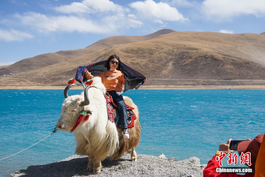 3月31日,游客在羊卓雍措骑着牦牛拍照。羊卓雍措位于西藏自治区山南市境内,是喜马拉雅山北麓最大的内陆湖泊,湖面海拔4440多米。春日,湖水与蓝天、白云、群山相互映衬,成群的水鸟振翅飞翔,构成一幅壮丽的生态画卷。中新社记者 马铭言 摄