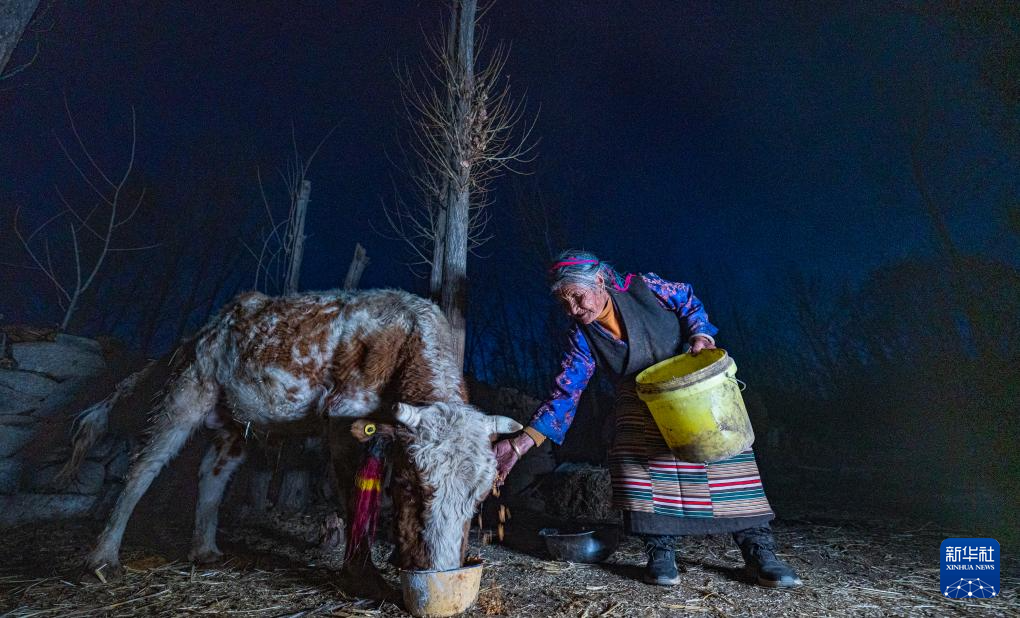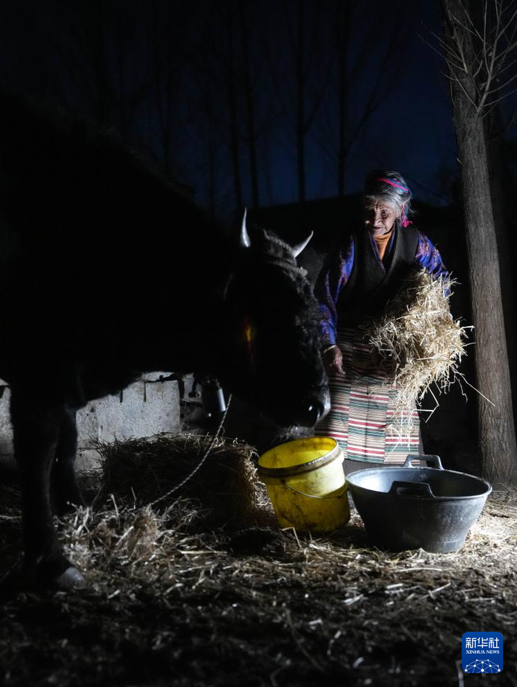 3月12日,格桑美多老人在家给牛喂草。新华社记者 晋美多吉 摄