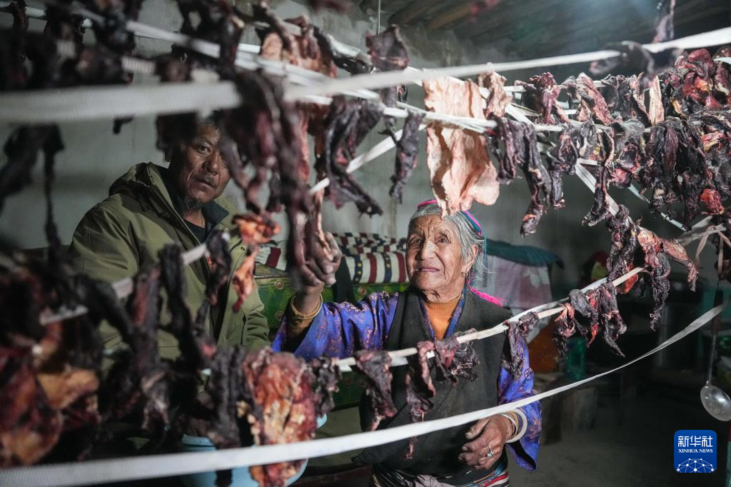 3月12日,格桑美多老人(右)拾取家里晒的风干牛肉。新华社记者 晋美多吉 摄