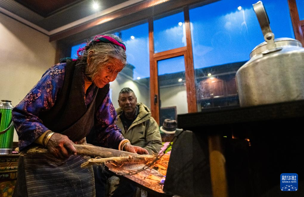 3月12日,格桑美多老人在家给火炉添柴。新华社记者 丁增尼达 摄