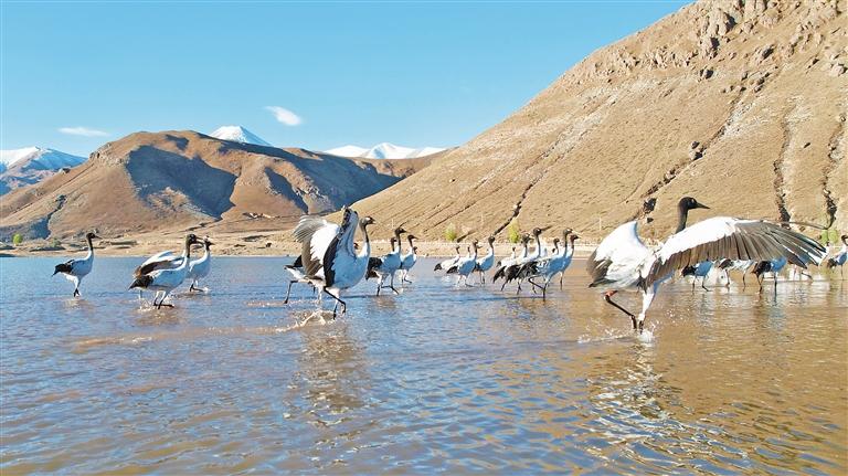黑颈鹤在林周县卡孜水库嬉戏。图片由记者 央金 林周融媒 提供