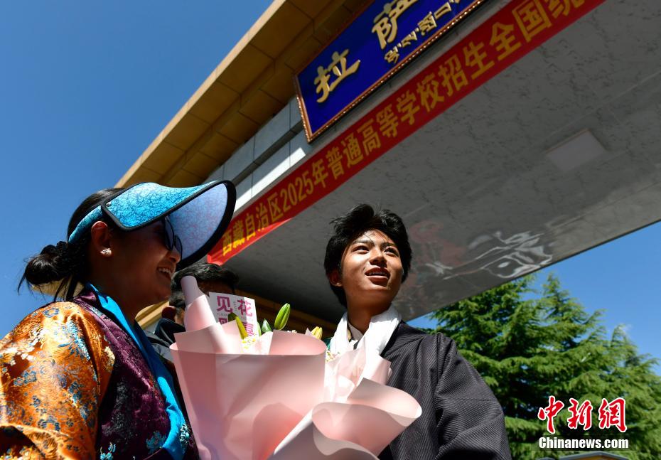 6月9日,西藏拉萨江苏实验中学考点外亲友为考生送鲜花。当日,西藏自治区2025年普通高考完成所有科目考试,2025年西藏高考落下帷幕。中新社记者 贡嘎来松 摄