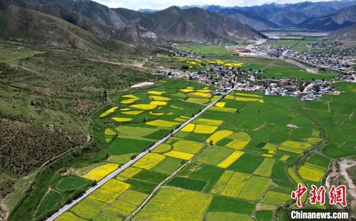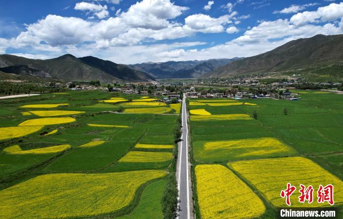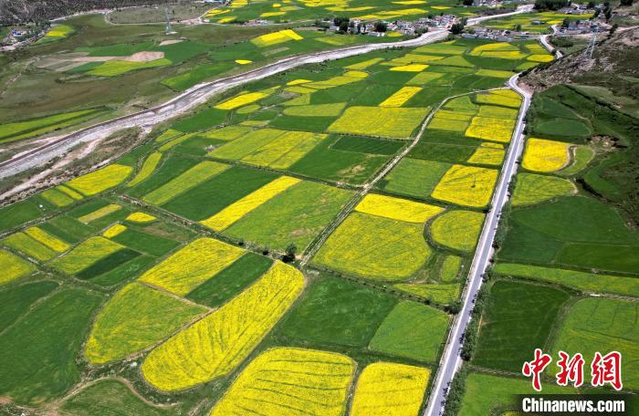 7月5日,西藏拉萨市墨竹工卡县油菜花盛放。无人机航拍视角下,一块块金黄的油菜花田犹如大地的调色板,风光宜人。(无人机照片)中新社记者 李林 摄