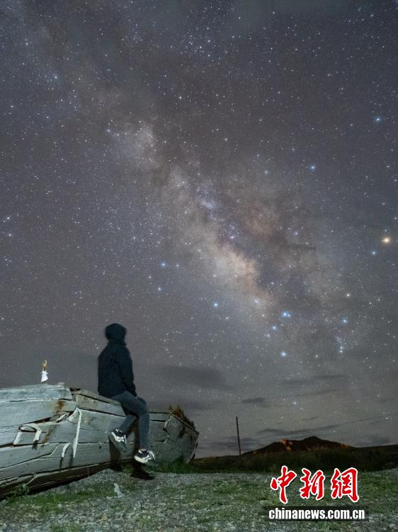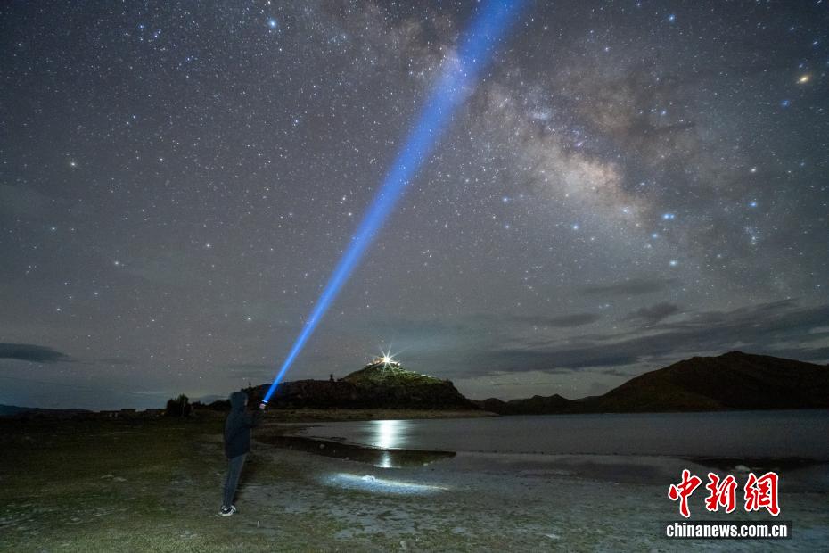 西藏山南羊卓雍错日托寺,因为海拔高、远离城市光污染,是理想的观星之地。近日,海拔4400多米的寺庙夜空清澈,银河清晰可见,璀璨星辰与羊卓雍错相映成趣,吸引游客和摄影爱好者观星拍摄。图为游客在羊卓雍错日托寺附近与银河“打卡”。江飞波 摄