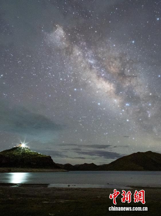 西藏山南羊卓雍错日托寺,因为海拔高、远离城市光污染,是理想的观星之地。近日,海拔4400多米的寺庙夜空清澈,银河清晰可见,璀璨星辰与羊卓雍错相映成趣,吸引游客和摄影爱好者观星拍摄。图为日托寺(灯光处)上空银河璀璨。江飞波 摄