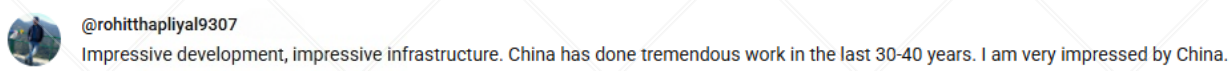 网友@rohitthapliyal9307说道,“多么令人瞩目的发展,多么令人印象深刻的基础设施。中国在过去三四十年里做出了巨大的贡献。我对中国印象深刻。”