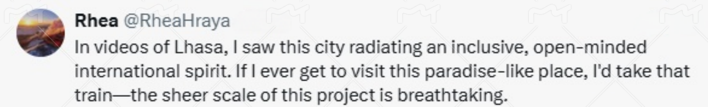 网友@Rhea表示,“在拉萨的视频中,我看到这座城市散发着包容、开放的国际精神。如果我有机会参观这个天堂般的地方,我会坐那列火车——这个项目(青藏铁路)的规模令人叹为观止。”
