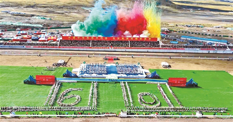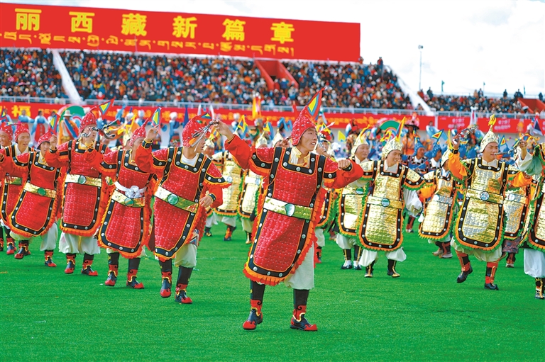 来自四川、青海及西藏本地的马术队英姿飒爽,跃马扬鞭;千人共舞《礼赞甲子》,舞步豪迈,衣袂飞扬,再现西藏六十年的沧桑巨变;器乐合奏《风从浙江来·乐在那曲扬》则巧妙融合江南韵律与草原风情,奏响对口支援的深情厚谊;《驮盐之歌》悠扬响起,仿佛将人们带回了古老的岁月,展现了高原儿女坚韧不拔的精神……赛马场核心区域,传统马术与现代艺术在这里交相辉映,引来掌声如潮、喝彩不绝。