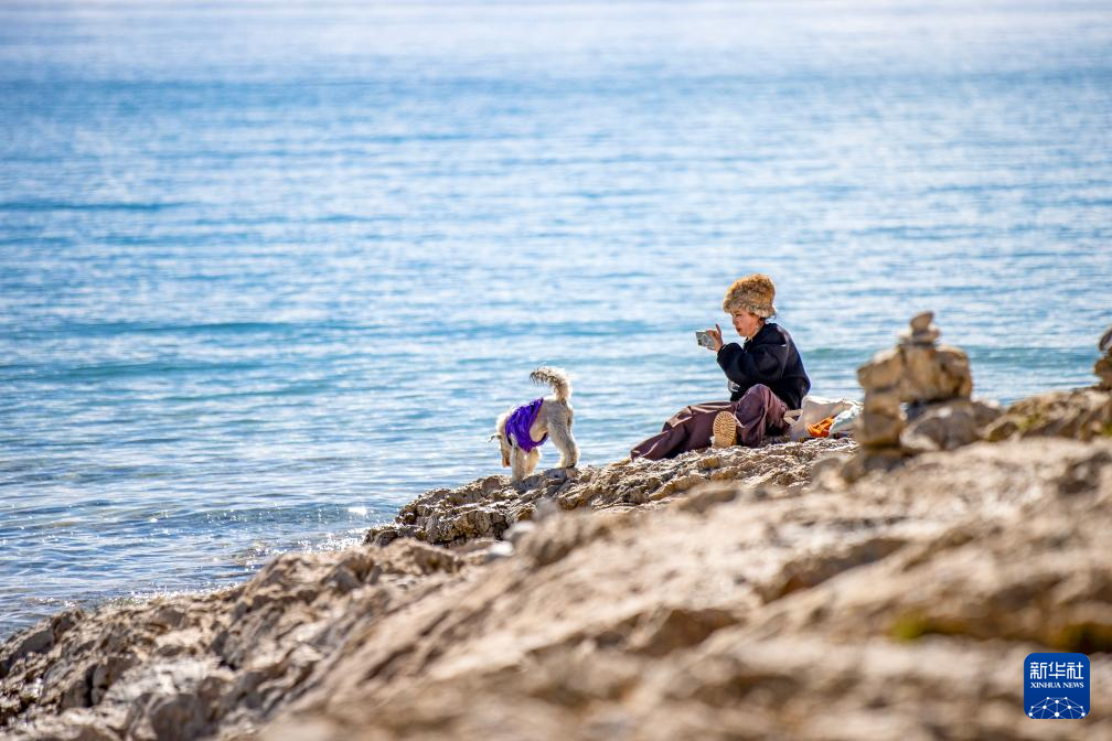 游客带着宠物狗在纳木错湖边拍照(9月16日摄)。新华社记者 姜帆 摄