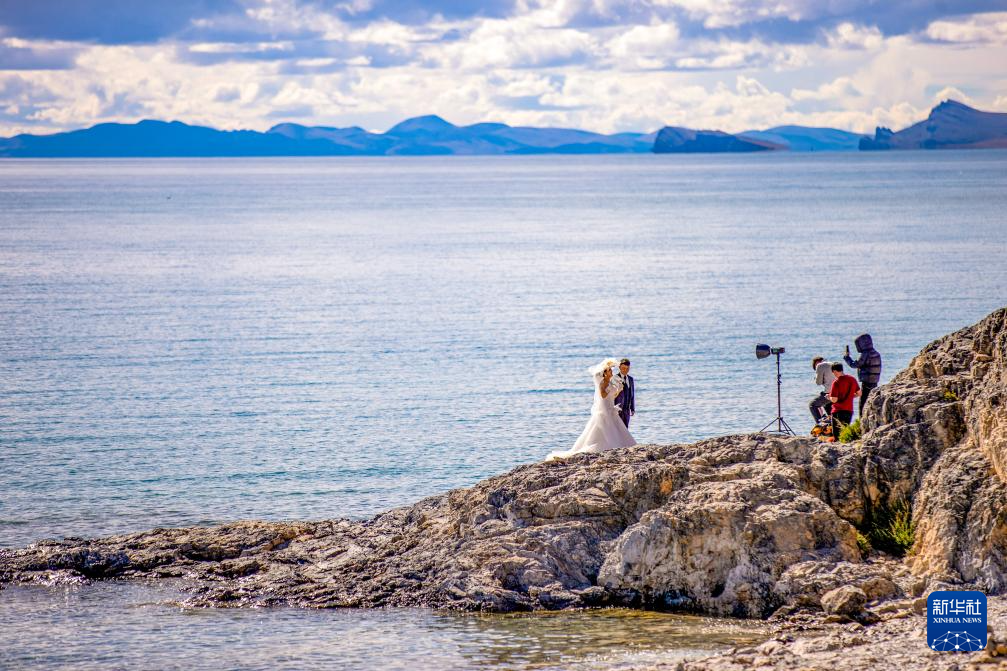 游客在纳木错湖边拍摄婚纱照(9月16日摄)。新华社记者 姜帆 摄