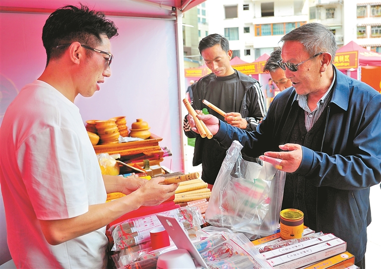 特色产品展销柜台,市民正在选购洛隆藏香。