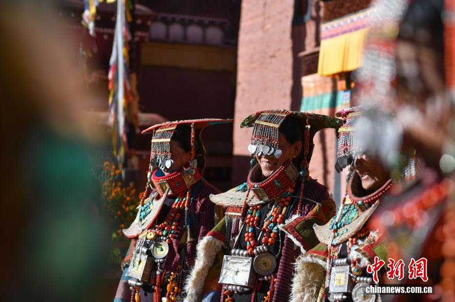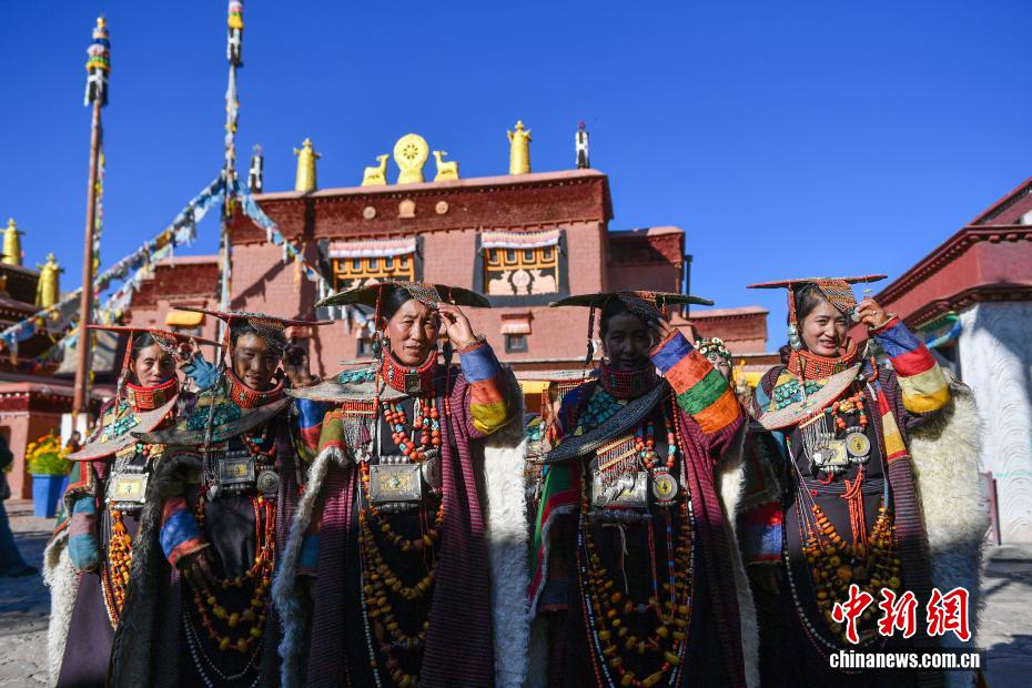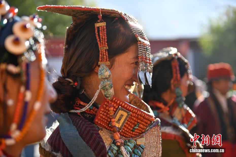 9月23日,西藏自治区阿里地区普兰县,至今保留着独特的藏族服饰——普兰服饰,它是中国国家级非物质文化遗产。普兰服饰已有1000多年的历史,其中最精美、最独特的是妇女的“孔雀服饰”,普兰县科迦村里有7户人家保存着7套祖传服饰,一套重达20多公斤,装饰有黄金、白银、松石、玛瑙、珊瑚、珍珠等,承载和沉淀了百年时光,堪称“穿在身上的千年史”。时至今日,这种美丽的服饰文化还在当地传承着。图为西藏阿里地区普兰县科迦村,村民在展示普兰服饰。贡确 摄