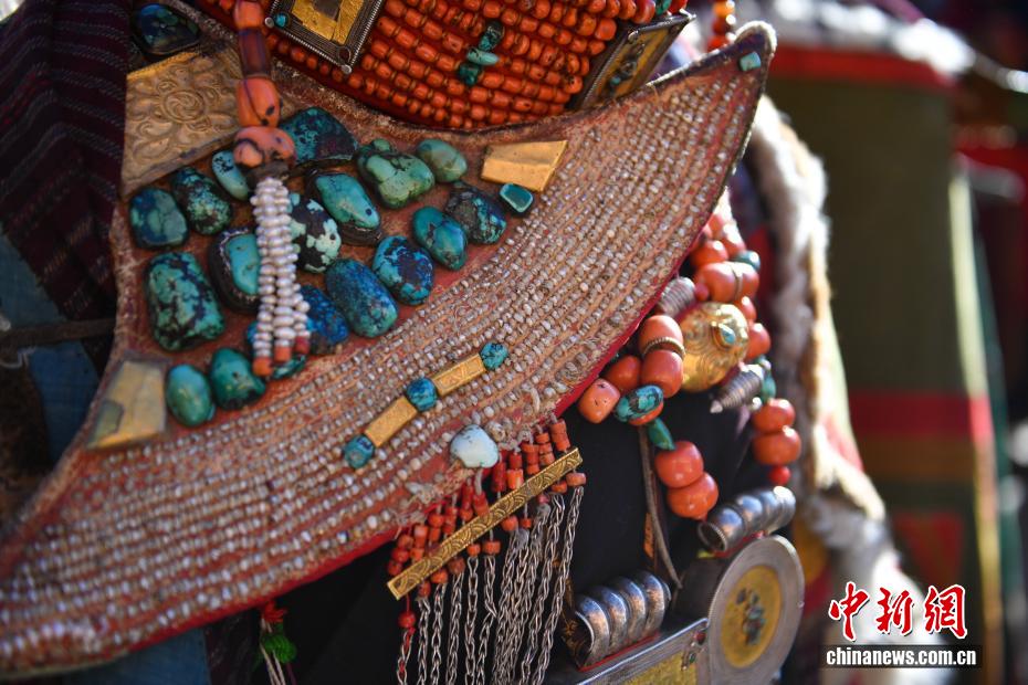 9月23日,西藏自治区阿里地区普兰县,至今保留着独特的藏族服饰——普兰服饰,它是中国国家级非物质文化遗产。普兰服饰已有1000多年的历史,其中最精美、最独特的是妇女的“孔雀服饰”,普兰县科迦村里有7户人家保存着7套祖传服饰,一套重达20多公斤,装饰有黄金、白银、松石、玛瑙、珊瑚、珍珠等,承载和沉淀了百年时光,堪称“穿在身上的千年史”。时至今日,这种美丽的服饰文化还在当地传承着。图为普兰服饰细节展示。贡确 摄