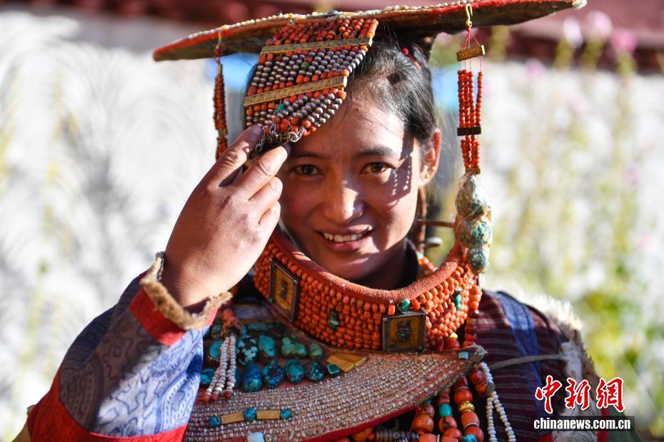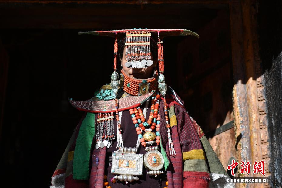 9月23日,西藏自治区阿里地区普兰县,至今保留着独特的藏族服饰——普兰服饰,它是中国国家级非物质文化遗产。普兰服饰已有1000多年的历史,其中最精美、最独特的是妇女的“孔雀服饰”,普兰县科迦村里有7户人家保存着7套祖传服饰,一套重达20多公斤,装饰有黄金、白银、松石、玛瑙、珊瑚、珍珠等,承载和沉淀了百年时光,堪称“穿在身上的千年史”。时至今日,这种美丽的服饰文化还在当地传承着。图为西藏阿里地区普兰县科迦村,一名妇女穿着普兰服饰。贡确 摄