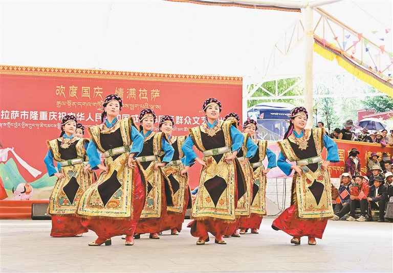 10月1日,宗角禄康公园内歌舞飞扬、欢声雷动,“欢度国庆·情满拉萨”拉萨市隆重庆祝中华人民共和国成立76周年群众文艺演出在这里举行。演出现场气氛热烈,富有民族特色的藏戏、传统歌舞接连上演,歌声、掌声、欢呼声此起彼伏,生动表达了拉萨各族人民对伟大祖国的美好祝愿。图为女子舞蹈《春韵》。记者 王敏 摄