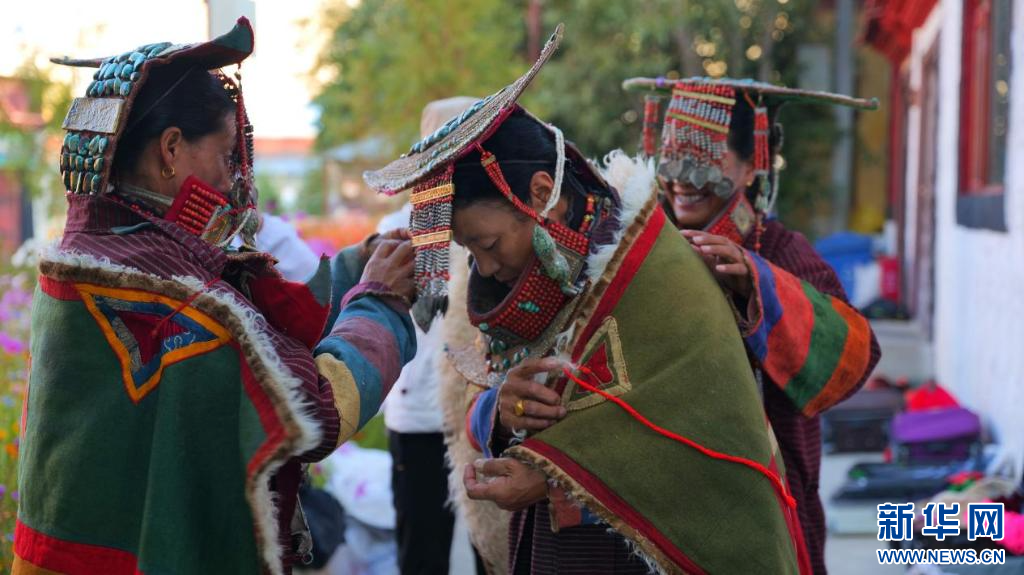 图为科迦村村民在互相帮忙穿戴普兰服饰(9月23日摄)。新华网 柑丹鸯琦 摄