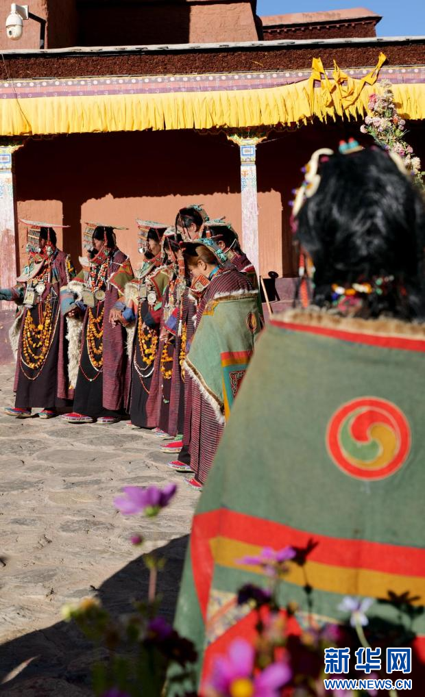 图为身穿普兰服饰的科迦村村民在表演宣舞(9月23日摄)。新华网 柑丹鸯琦 摄