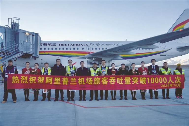 10月20日,西藏航空TV9705航班平稳降落在阿里普兰机场,作为阿里普兰机场2025年第10000名旅客,乘客果果在工作人员的掌声中走下飞机,接受机场工作人员敬献的哈达和鲜花。这一刻,是阿里普兰机场实现年旅客吞吐量“从千到万”的历史性跨越。