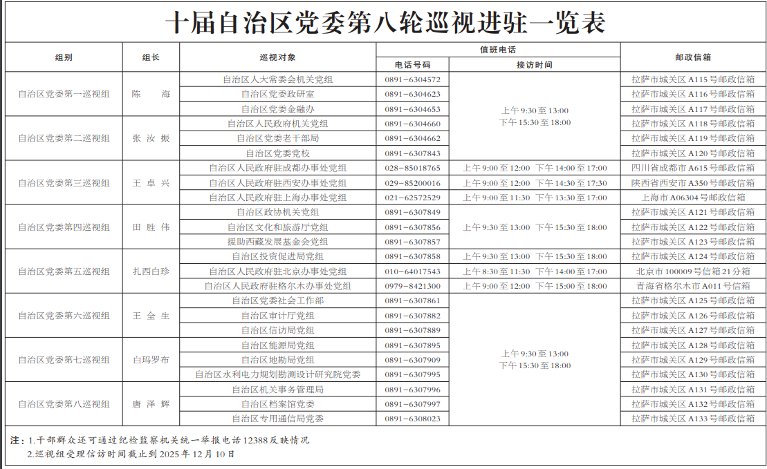 据悉,各巡视组将在被巡视单位工作50天左右,期间设专门值班电话和邮政信箱,开通信访意见箱等信访渠道,主要受理反映被巡视党组织领导班子及其成员、下一级党组织主要负责人和重要岗位领导干部问题的来信来电来访,重点是关于违反政治纪律、组织纪律、廉洁纪律、群众纪律、工作纪律、生活纪律等方面的举报和反映。巡视组受理信访时间截止到2025年12月10日。