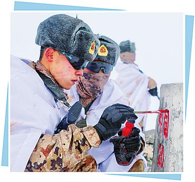 天色渐暗,山顶气温骤降,寒风呼啸。官兵们脸上没有一丝畏惧,年轻的面庞更加坚毅,互相鼓励的声音在队伍中回荡,“界碑不远了,再加把劲!”
