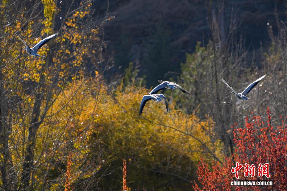 11月17日,西藏拉萨迎来大批越冬候鸟。拉萨河、宗角禄康公园等地,成为了它们的栖息天堂。在宗角禄康公园内,赤麻鸭、斑头雁成群结队,时而低头觅食,时而水中嬉戏。它们的身影引得市民和游客纷纷驻足观赏、拍照留念,构成了一幅人与自然和谐共生的美丽画卷。图为斑头雁从宗角禄康公园上方飞过。贡确 摄
