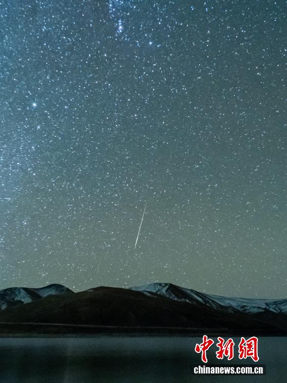 西藏羊卓雍错简称羊湖,藏语意为“碧玉湖”,湖面海拔4400多米,是西藏三大“圣湖”之一。近日,今年的狮子座流星雨达到峰值,每小时约能看到15颗流星。中新网记者在羊湖畔拍摄到初冬的羊湖银河及狮子座流星划过高原夜空等画面。图为11月16日晚,一颗狮子座流星划过羊湖附近的雪山上空。江飞波 摄