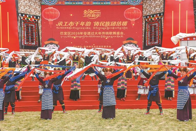 11月21日(工布新年大年初一),在林芝市巴宜区依舍庄园,“承工布千年韵 铸民族团结情”——巴宜区2026年“非遗过大年”传统歌舞盛会精彩上演。整场演出围绕工布年味、非遗传承、民族团结三大主题,分设“岁月如歌·福满工布”“匠心欢歌·情系家园”“团结欢歌·共谱华章”三大篇章,20余个节目涵盖男女声独唱、民俗舞蹈、器乐演奏等多种表演形式,将高原独特民俗风情与深厚文化底蕴相融合,为市民游客带来了一场具有民族特色的视听盛宴。