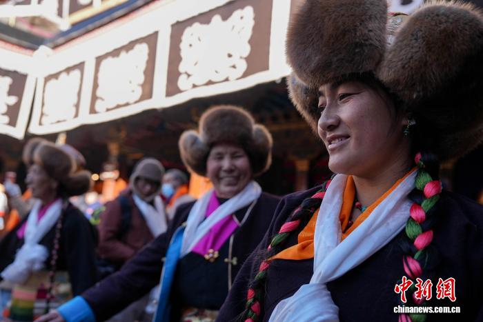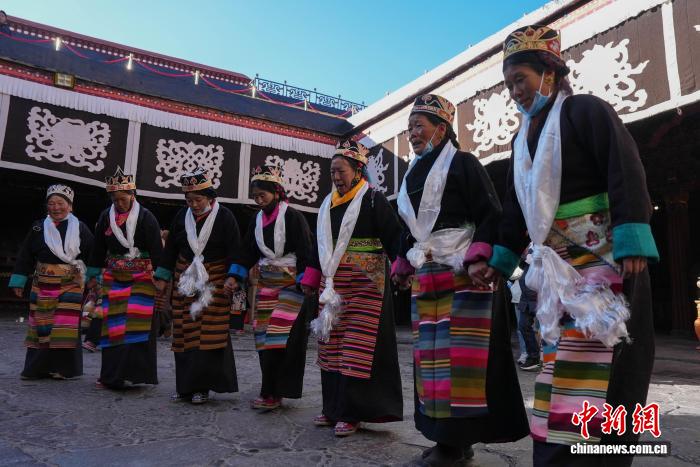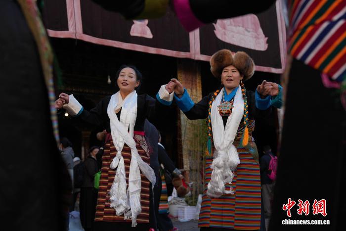 11月28日,随着藏历十月十五白拉姆节临近,连日来,拉萨及周边信众身着色彩艳丽的藏装节日盛装,手持从家中精心准备的头等青稞酒、新收的青稞及新鲜水果,陆续前往大昭寺、色拉寺、哲蚌寺等寺庙朝拜祈福。大昭寺内,信众敬献供品后载歌载舞,歌声悠扬、舞步轻快,尽显节日喜悦。白拉姆节又称 “仙女节”。相传,白拉姆是拉萨地区的保护神,是藏传佛教最高护法神之一班丹拉姆的女儿。白拉姆曾与大昭寺护法神赤尊赞相互爱慕并私定终身,其母亲班丹拉姆发现后,赤尊赞被赶到拉萨河南岸,每逢藏历十月十五日,二人才能隔河相见一次。图为白拉姆节临近之际,信众在大昭寺内敬献供品后载歌载舞的场景。贡确 摄