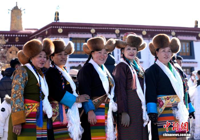 图为拉萨妇女盛装在大昭寺广场合影。中新社记者 李林 摄