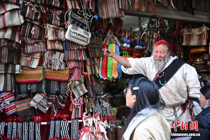 图为藏式老物件店主次仁罗布给游客推荐藏式氆氇侧挂包。中新社记者 贡嘎来松 摄