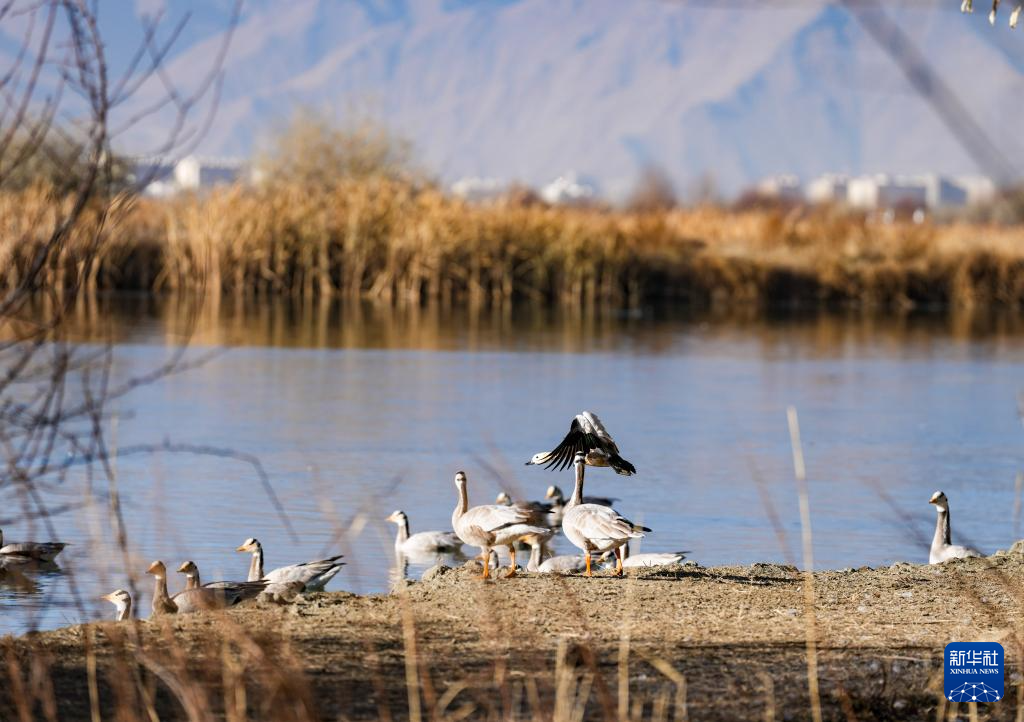 12月20日,斑头雁飞翔在拉鲁湿地上空。新华社记者 晋美多吉 摄