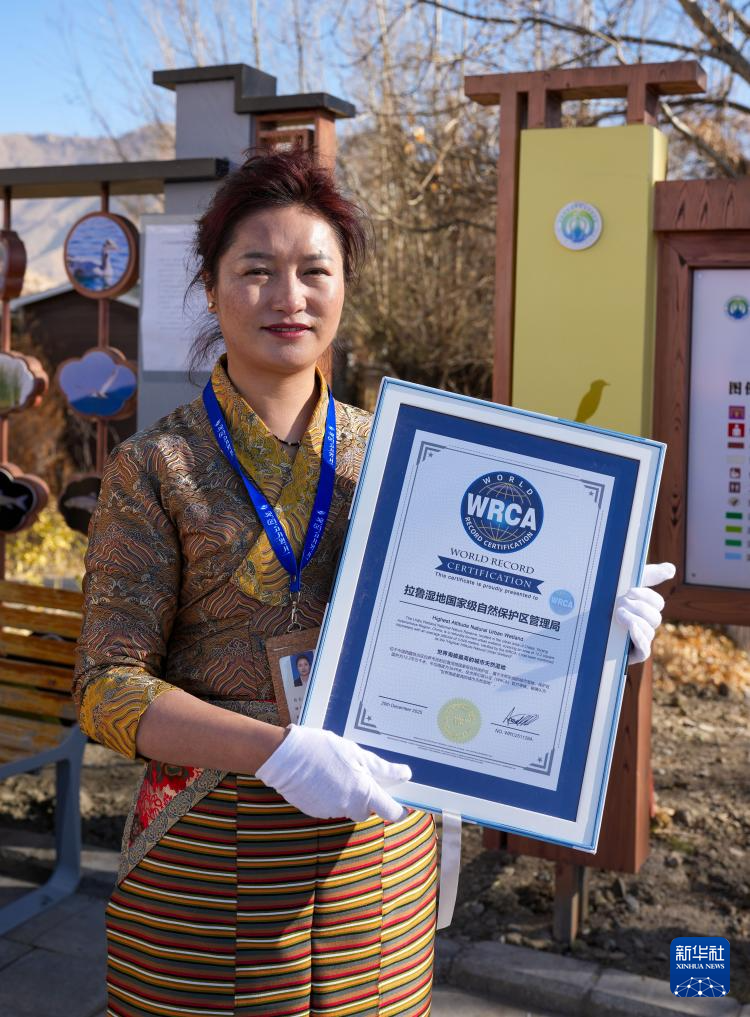 12月20日,拉鲁湿地国家级自然保护区工作人员展示拉鲁湿地获得的“世界海拔最高的城市天然湿地”证书。新华社记者 晋美多吉 摄