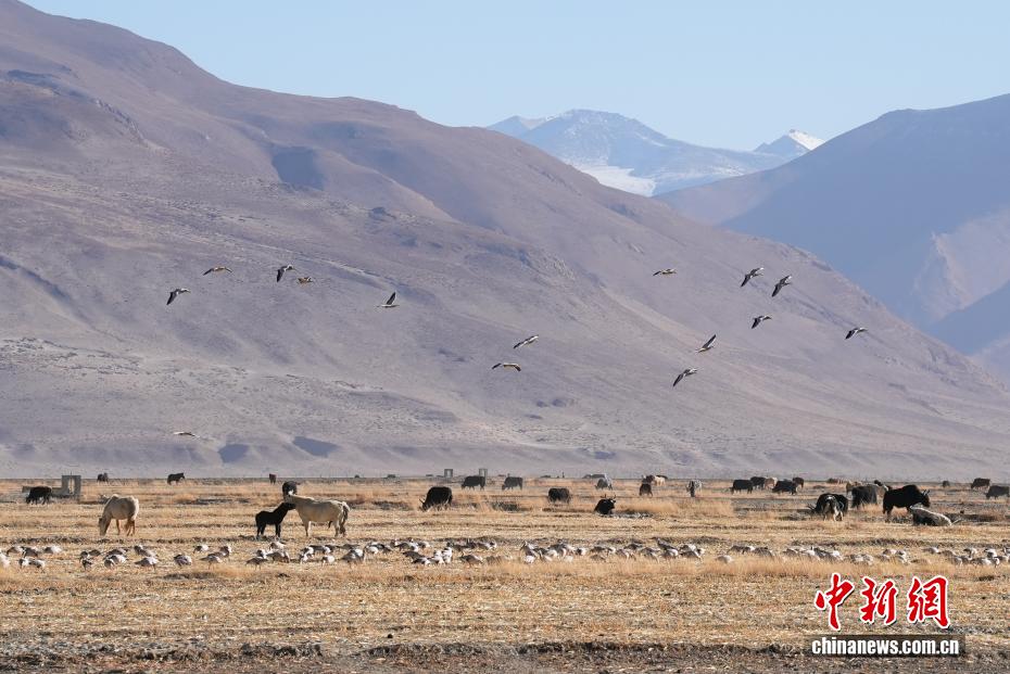 2025年1月7日,西藏定日发生6.8级地震,时隔近一年,12月24日,中新社记者探访灾后重建。日喀则森嘎村的藏式新房错落有致,柏油路连通家家户户,屋顶太阳能热水器整齐排列,炊烟袅袅间满是生机。据悉,此次日喀则地震灾后重建覆盖7县47乡镇486村,2.2万余户重建民房、1.05万余户维修加固民房已全部竣工交付,受灾民众喜迁新居。图为森嘎村境内的农田里斑头雁在觅食。中新社记者 贡嘎来松 摄