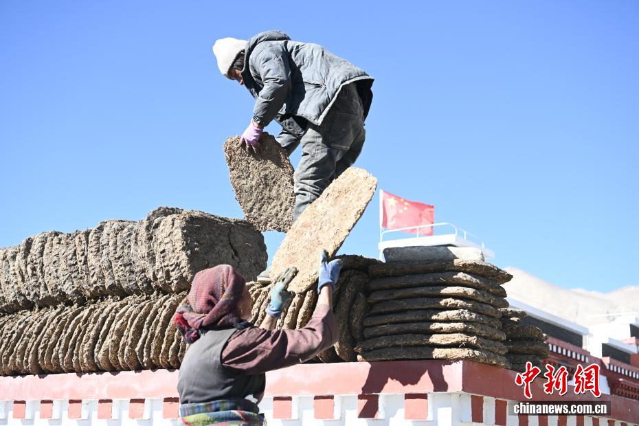 2025年1月7日,西藏定日发生6.8级地震,时隔近一年,12月24日,中新社记者探访灾后重建。日喀则森嘎村的藏式新房错落有致,柏油路连通家家户户,屋顶太阳能热水器整齐排列,炊烟袅袅间满是生机。据悉,此次日喀则地震灾后重建覆盖7县47乡镇486村,2.2万余户重建民房、1.05万余户维修加固民房已全部竣工交付,受灾民众喜迁新居。图为重建后的森嘎村村民在自家的新房围墙上摆放干牛粪。中新社记者 贡嘎来松 摄