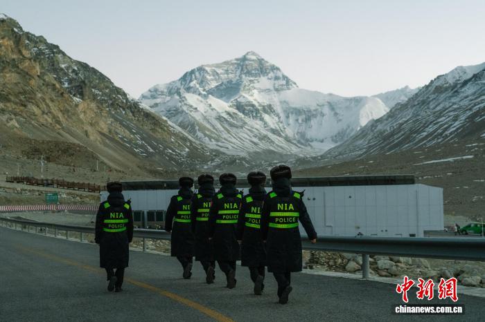 24日,西藏出入境边防检查总站珠峰边境派出所的移民管理警察们穿梭在珠峰大本营景区的各个角落,开展常态化巡逻执勤工作。