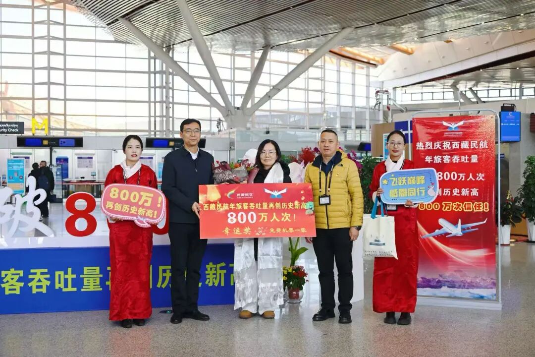 图为当天在拉萨贡嘎国际机场抽取了第800万名的幸运旅客与工作人员合影