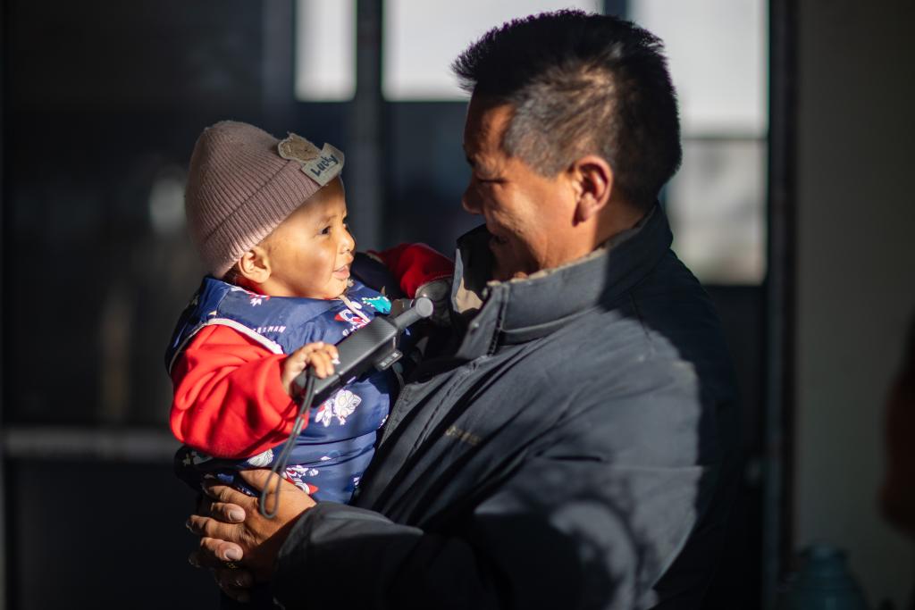 2026年1月5日,在西藏定日县长所乡杂村,长所乡乡党委书记次仁旺堆(右)在次仁拉巴家中逗弄他。地震后在临时板房居住期间,他曾当过宝宝的临时保姆。新华社记者 姜帆 摄